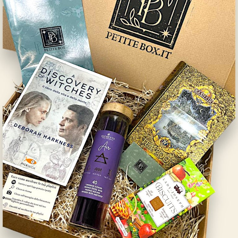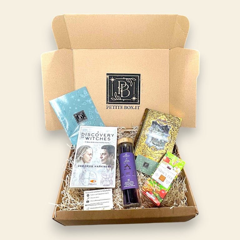 La Petite Box "Pagine Stregate" è la chiave per accedere a questo mondo. È un invito a un'esperienza sensoriale completa, un rituale pensato per farti immergere in atmosfere dense di storia, tra i profumi di pergamena e spezie antiche, e i sapori che suggeriscono storie nascoste.
